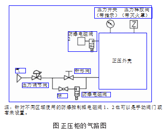 正壓柜的空氣回路如下圖所示。通風時,防爆電磁閥1和防爆電磁閥2同時打開。壓縮空氣經(jīng)調壓閥減壓后,一路從針閥節(jié)流進入正壓外殼,另一路通過防爆電磁閥1進入外殼。外殼中的氣體通過防爆電磁閥2排出。為了防止外殼中的壓力急劇上升并由于通過防爆電磁閥1的過量流量而損壞外殼,在旁路電磁閥1的前面安裝了一個球閥作為節(jié)流閥,以限制通過電磁閥1的流量并基本上平衡流入和流出正壓外殼的流量。泄壓閥既可用作排氣口,也可用作安全閥。正常運行時,電磁閥1和電磁閥2關閉,壓縮空氣由調壓閥減壓,由針閥節(jié)流,然后進入正壓外殼,空氣從泄壓閥的排氣孔排出。